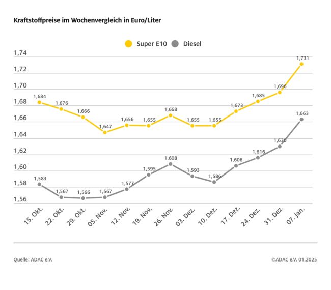 ADAC: Tanken in der ersten Januarwoche deutlich teurer – Preis für Super E10 steigt gegenüber Vorwoche um 3,5 Cent, Diesel um 3,3 Cent – Ursache sind höhere CO2-Abgabe und gestiegener Rohölpreis