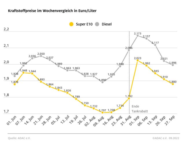 München (ots) Kraftstoffpreise im Wochenvergleich Quelle: ADAC e.V.   Erstmals seit fünf Wochen ist der Preis für Diesel-Kraftstoff wieder unter die Marke von zwei Euro gesunken. Wie die aktuelle ADAC Auswertung der Kraftstoffpreise in Deutschland zeigt, kostet ein Liter Diesel im bundesweiten Schnitt 1,996 Euro und damit 2,5 Cent weniger als vor einer Woche. Zuletzt lag…