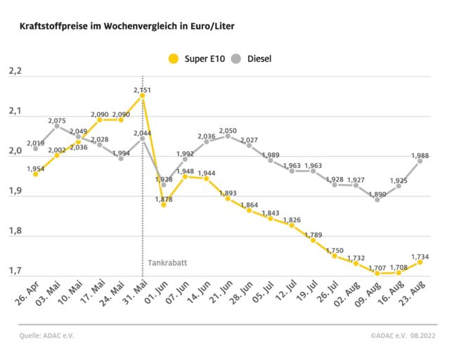 München (ots) – Der teuerste Tag zum Tanken im August war für beide Sorten der letzte Tag des Monats. Bereits zwei Wochen vor dem Auslaufen des Tankrabatts stiegen die Preise seit Monatsmitte kontinuierlich an und fanden am 31. August ihren Höhepunkt mit 1,792 Euro für den Liter Super E10 und 2,086 Euro je Liter Diesel. Deutlich…