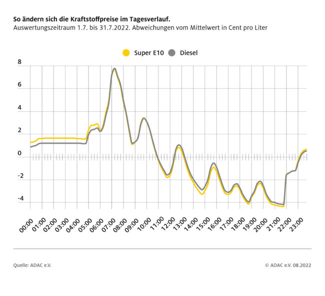 München (ots)   Für die Fahrer von Benziner-Pkw ist das Sparpotenzial beim Tanken durch die Wahl des richtigen Zeitpunktes in den vergangenen Monaten größer geworden. Wie eine aktuelle ADAC Auswertung der durchschnittlichen Kraftstoffpreise im Tagesverlauf zeigt, können Autofahrer rund zwölf Cent je Liter Super E10 sparen, wenn sie abends statt morgens tanken. Noch im Mai lag…
