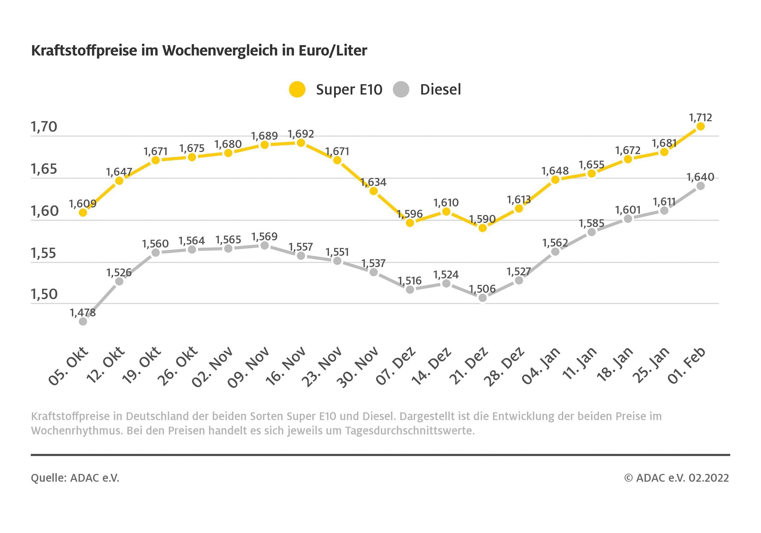 Auch der Dieselpreis setzt seinen Höhenflug fort und erreicht ebenfalls ein neues Allzeithoch. Ein Liter kostet laut ADAC aktuell 1,640 Euro und damit 2,9 Cent mehr als in der Vorwoche.
