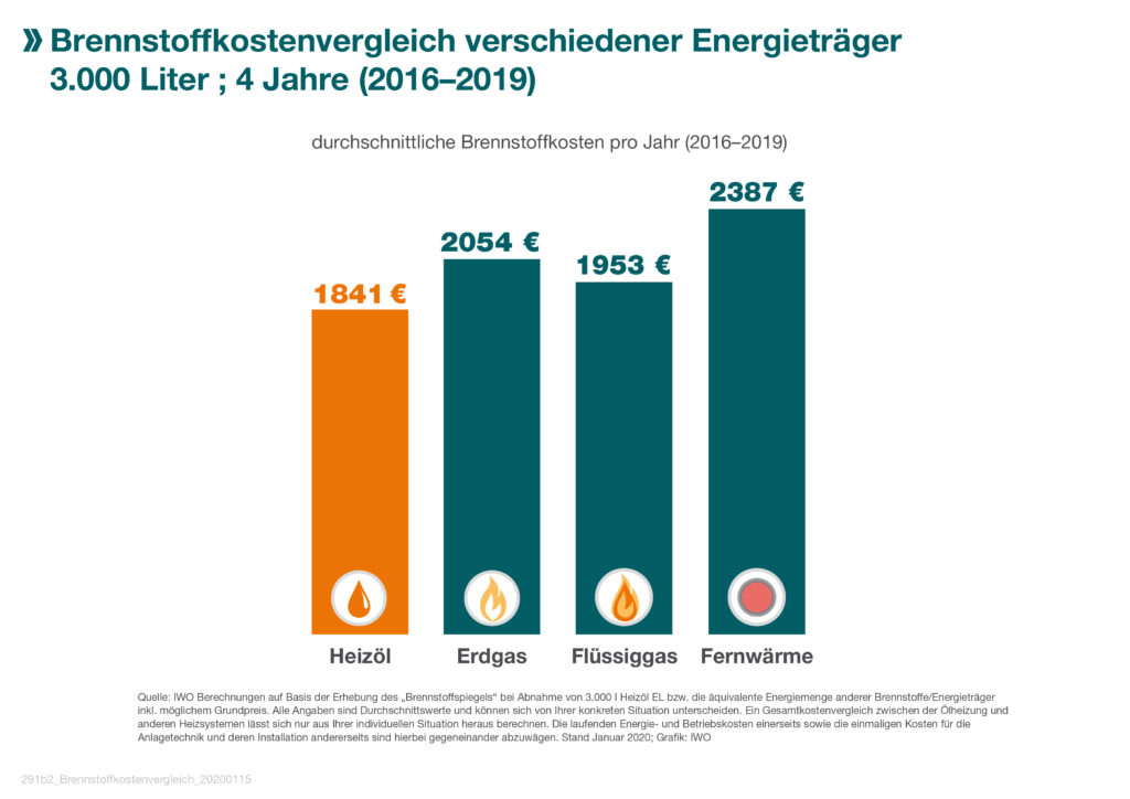 Die durchschnittlichen Energiekosten pro Jahr von 2016 bis 2019: 1.841 Euro kosteten Ölheizer 3.000 Liter Heizöl, am teuersten war in diesem Vergleich die vergleichbare Energiemenge Fernwärme mit 2.387 Euro. Grafik: IWO