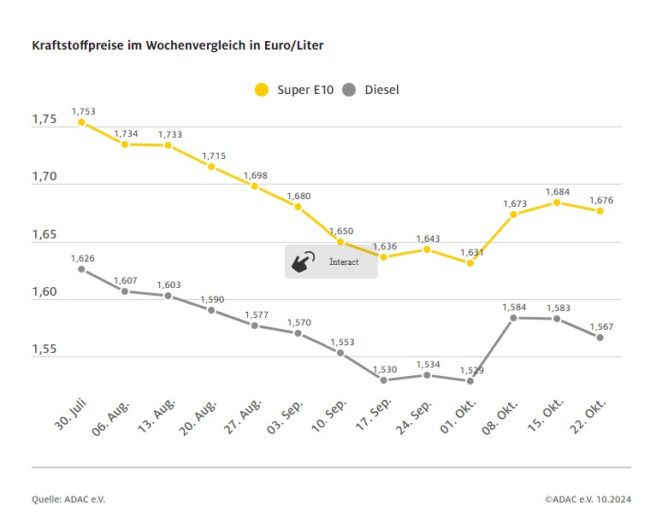 München (ots)Die Preise für Super E10 und Diesel sind etwas gesunken. Gegenüber der Vorwoche zeigt die aktuelle ADAC Auswertung der Kraftstoffpreise von mehr als 14.000 Tankstellen in Deutschland einen Rückgang von 0,8 Cent pro Liter bei Super E10 und von 1,6 Cent bei Diesel. Im Durchschnitt kostete am 22. Oktober ein Liter Benzin 1,676 Euro, für…