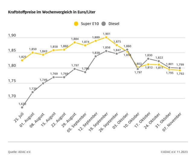 ADAC: Benzin und Diesel geringfügig billiger – Preise beider Kraftstoffsorten knapp unter der Marke von 1,80 Euro – Ölpreis deutlich gesunken, Spritpreise noch nicht