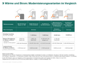 Wird die veraltete Ölheizung von einer Gas-Brennwertheizung ersetzt, liegen die einmaligen Investitionen schon bei 13.000 Euro. Und mit 24.800 Euro muss derjenige rechnen, der sich eine Strom-Wärmepumpe einbaut. Mit der steigen dann auch die laufenden Kosten, da sich der externe Strombedarf bei dieser Lösung auf 13.350 kWh erhöht: rund 3.400 Euro pro Jahr sind dann fällig.