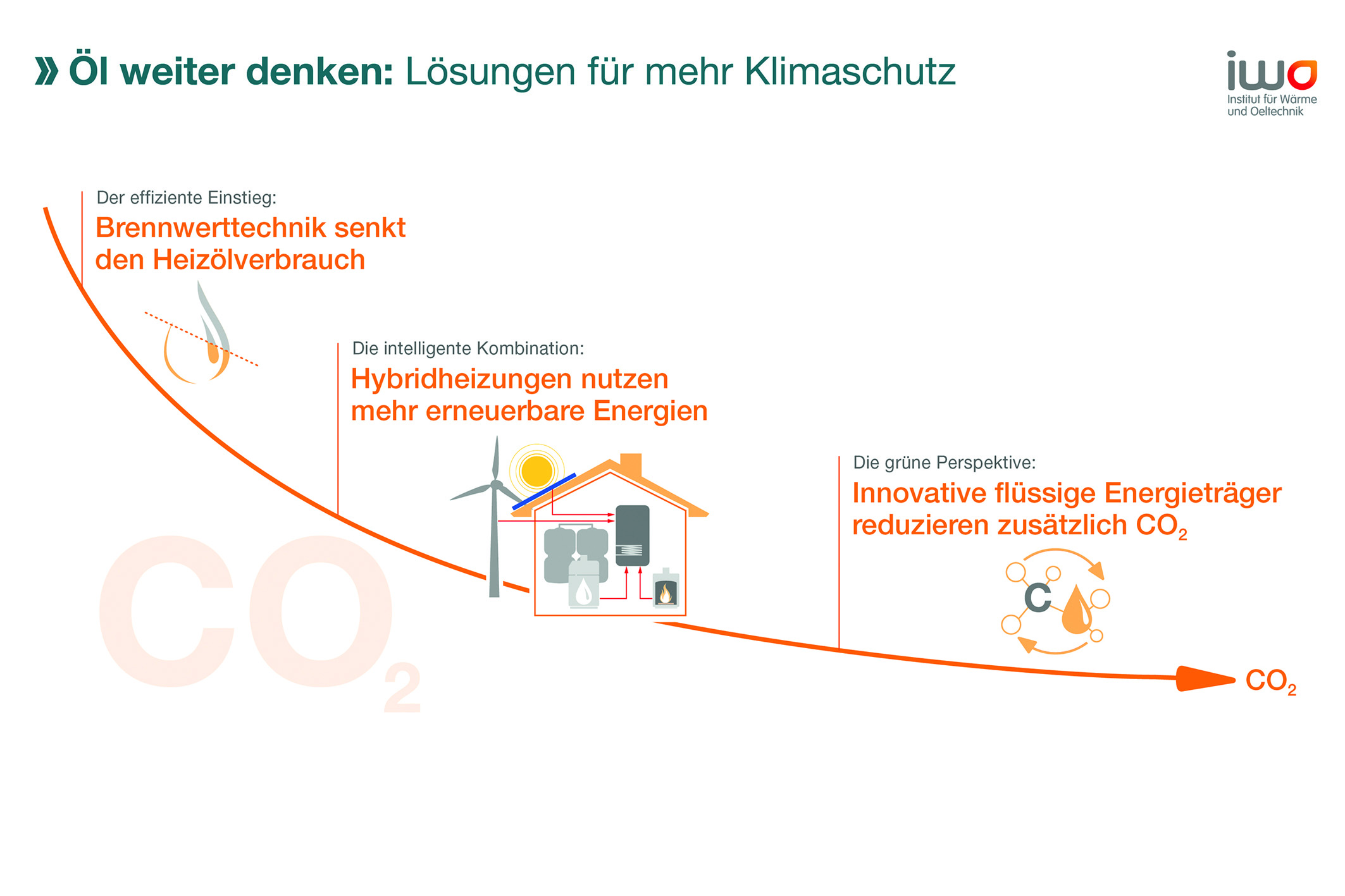 In drei Schritten in die Zukunft: Effizienzsteigerungen mit moderner Technik, erneuerbare Energien nutzen und treibhausgasreduzierte Brennstoffe tanken – so erreichen Gebäude auch mit einer Ölheizung die Klimaziele. Grafik: IWO