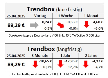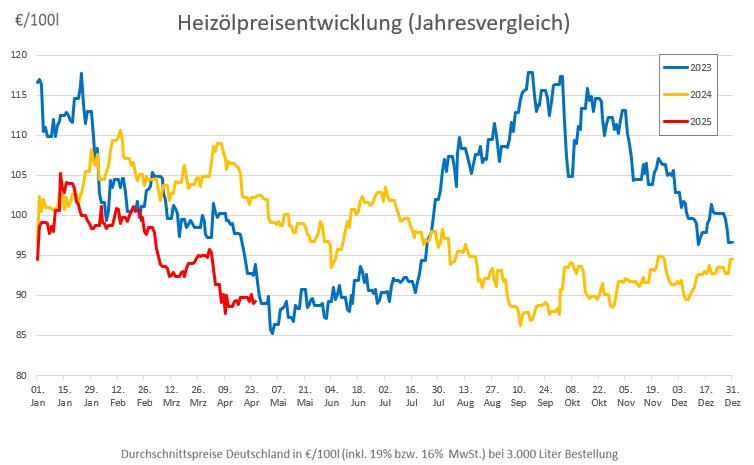 Die genannten Heizölpreise beziehen sich stets auf den deutschlandweiten Durchschnittspreis bei einer Bestellung von 3.000 Liter Heizöl Standard schwefelarm inklusive 19% MwSt. Außerdem fallen durch Transportkosten die Preise regional unterschiedlich aus. Stand der Preise 25.04.2025