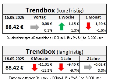 Nachdem die Heizölpreise bereits in der ersten vollen Maiwoche leichte Preisaufschläge verbuchen mussten, ging es in der abgelaufenen Woche mit den Notierungen weiter spürbar nach oben. Am Freitag mussten im Bundesgebiet durchschnittlich 88,42 Euro für 100 Liter gezahlt werden.