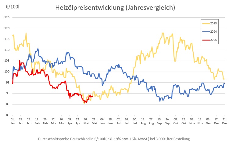 Die genannten Heizölpreise beziehen sich stets auf den deutschlandweiten Durchschnittspreis bei einer Bestellung von 3.000 Liter Heizöl Standard schwefelarm inklusive 19% MwSt. Außerdem fallen durch Transportkosten die Preise regional unterschiedlich aus. Stand der Preise 16.05.2025