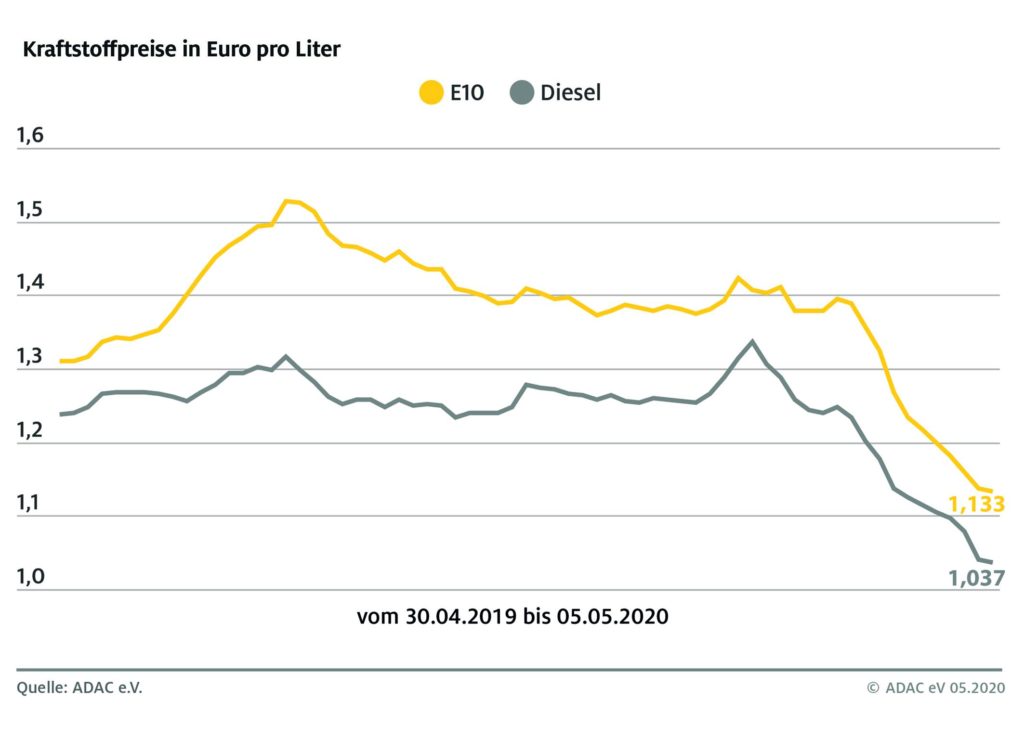 München (ots) – Der Abwärtstrend der Kraftstoffpreise dauert an. Tanken ist im bundesweiten Durchschnitt bereits die elfte Woche in Folge billiger geworden. Kostete ein Liter Super E10 im Bundesmittel in der Vorwoche noch 1,136 Euro, so sind es laut aktueller Auswertung des ADAC in dieser Woche 1,133 Euro. Diesel verbilligte sich ebenfalls um 0,3 Cent auf durchschnittlich 1,037 Euro je Liter. Zu günstigen Tageszeiten konnte man Diesel sogar für weniger als einen Euro tanken. Die Preisdifferenz zwischen beiden Kraftstoffsorten beträgt wie schon in der Vorwoche 9,6 Cent.