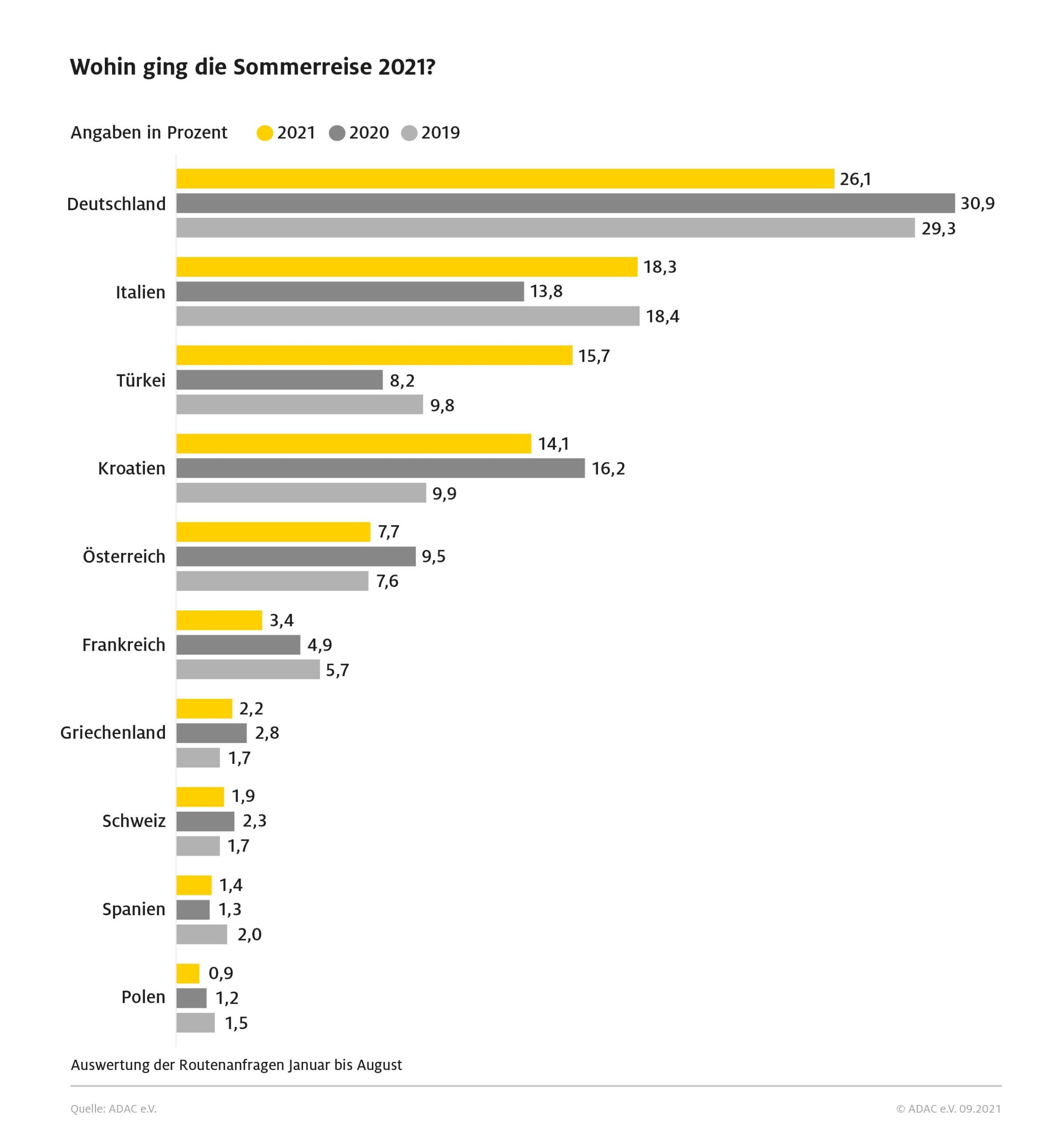 Konkret haben Urlauber in diesem Sommer besonders häufig Deutschland als Reiseziel gewählt. Nach einer Auswertung des ADAC von knapp 380.000 Routenplanungen, die im Rahmen der Urlaubsberatung von ADAC Mitgliedern getätigt wurden, bleibt Deutschland mit 26,1 Prozent das beliebteste Reiseziel im Jahr 2021. Es verliert aber gegenüber 2020 (- 4,8 Prozent). Italien belegt Platz zwei und konnte u.a. wegen des mäßigen Wetters in Teilen von Deutschland und wegen der aufgehobenen Beschränkungen deutlich zulegen (+ 4,5 Prozent). Es hat als Reisedestination fast die Bedeutung erreicht, die es vor der Pandemie hatte. Deutlich mehr Menschen besuchten in diesem Sommer die Türkei, das Land belegt mit 7,5 Prozent Zuwachs im Ranking Platz 3. Kroatien, das 2020 stark gewachsen war, büßt geringfügig wieder ein und ist im Sommer 2021, das viert-beliebteste Urlaubsland.