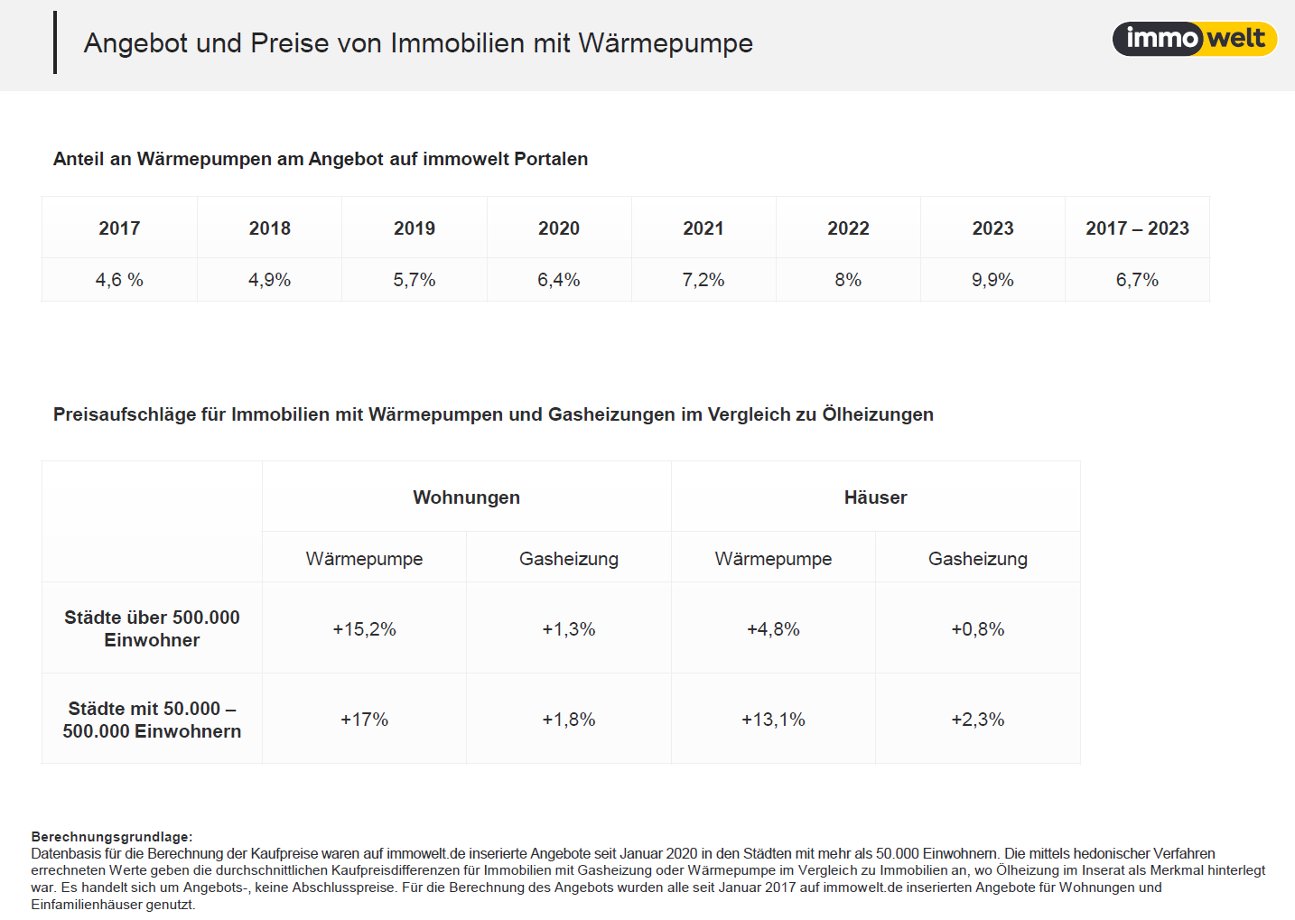 - Gefragte Immobilien: Wohnungen mit Wärmepumpe kosten im Mittel bis zu 17 Prozent mehr als mit Ölheizung, Häuser bis zu 13 Prozent