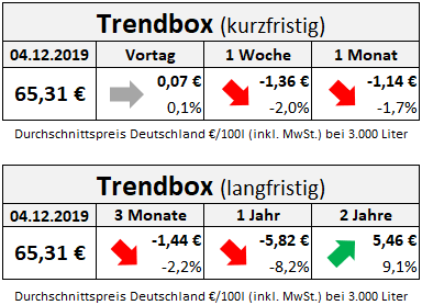 Kurz vor Ende der OPEC-Verhandlungen schauen wir noch einmal auf den Jahresverlauf der Heizölpreise. In der Jahresentwicklung zeigt sich, dass wir aktuell auf einen Recht guten Preis blicken können. „Gut“ im Sinne von, er ist niedriger als vor einer Woche, einem Monat, drei Monaten und vor einem Jahr. Nur an das Niveau von vor zwei Jahren werden wir so schnell nicht mehr ran kommen. Die Trendbox zeigt diese Entwicklung recht deutlich.