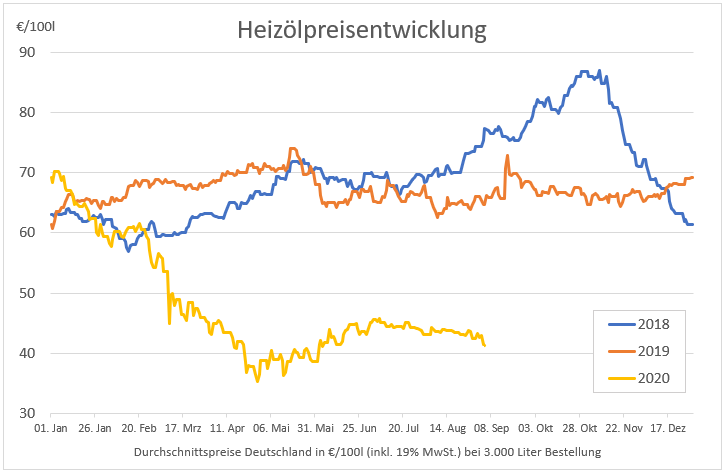 Die genannten Heizölpreise beziehen sich stets auf den deutschlandweiten Durchschnittspreis bei einer Bestellung von 3.000 Liter Heizöl Standard schwefelarm inklusive 19% MwSt. Bitte beachten Sie, dass es wegen der Mehrwertsteuersenkung bis Januar 2021 zu Preisabweichungen kommen kann. Außerdem fallen durch Transportkosten die Preise regional unterschiedlich aus. Die Preisspanne zwischen den Regionen kann daher momentan bei bis zu ca. 2,00 Euro pro 100 Liter liegen. Stand der Preise 04.09.2020
