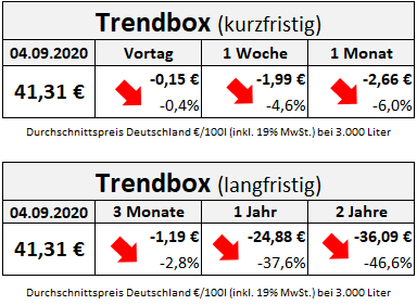 In der aktuellen Woche hatten die Heizölpreise im bundesweiten Durchschnitt bereits mit der 43 Euro-Marke zu kämpfen. Die kurzfristige Trendbox zeigt heute sowohl auf Wochen- als auch auf Monatssicht erneut einen Preisrückgang. Im Vergleich zur vergangenen Woche beläuft sich dieser auf -1,99 €, im Monatsvergleich sind es mittlerweile -2,66 €.