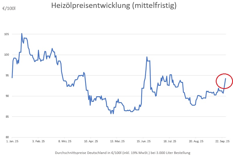 Die genannten Heizölpreise beziehen sich stets auf den deutschlandweiten Durchschnittspreis bei einer Bestellung von 3.000 Liter Heizöl Standard schwefelarm inklusive 19% MwSt. Außerdem fallen durch Transportkosten die Preise regional unterschiedlich aus. Stand der Preise 26.9.2025