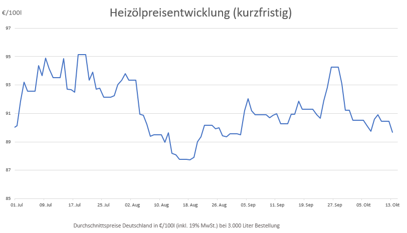 Die genannten Heizölpreise beziehen sich stets auf den deutschlandweiten Durchschnittspreis bei einer Bestellung von 3.000 Liter Heizöl Standard schwefelarm inklusive 19% MwSt. Außerdem fallen durch Transportkosten die Preise regional unterschiedlich aus. Stand der Preise 13.10.2025