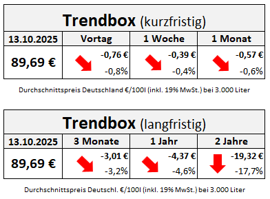 Im Vergleich zur Vorwoche ist der durchschnittliche Heizölpreis im Bundesgebiet derzeit etwa -0,39 Euro je 100 Liter günstiger, im Monatsvergleich -0,57 Euro je 100 Liter. Allgemein sinkt der Preis von Heizöl in den letzten Jahren stetig weiter, verglichen mit letztem Jahr ist Heizöl in Deutschland derzeit durchschnittlich -4,37 Euro je 100 Liter günstiger als zur selben Zeit 2024.