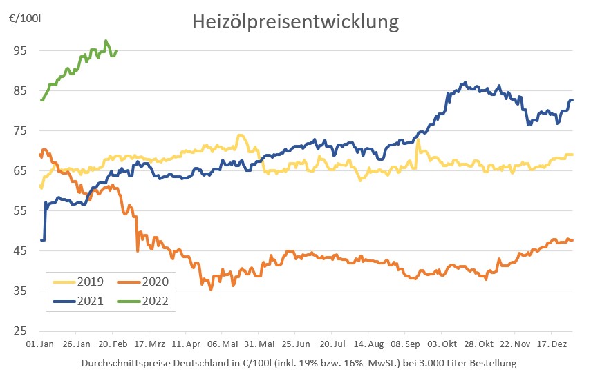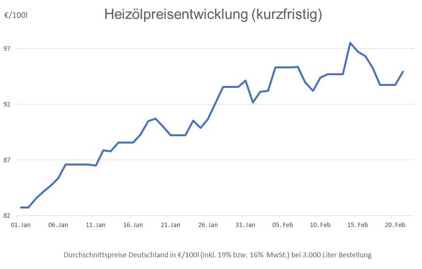 Die genannten Heizölpreise beziehen sich stets auf den deutschlandweiten Durchschnittspreis bei einer Bestellung von 3.000 Liter Heizöl Standard schwefelarm inklusive 19% MwSt. bzw. vom Zeitraum 1.Juli bis 31.Dezember 2020 16% MwSt. Außerdem fallen durch Transportkosten die Preise regional unterschiedlich aus. Die Preisspanne zwischen den Regionen kann daher momentan bei bis zu ca. 1,59 Euro pro 100 Liter liegen. Stand der Preise 21.02.2022