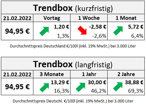 Im Vergleich zu Freitag kostet Heizöl die Verbraucher heute im Bundesdurchschnitt etwa 1,20 Euro mehr, das ist eine Preissteigerung von etwa 1,3 Prozent. Allerdings bleibt Heizöl damit zum Wochenauftakt etwa 2,58 Euro günstiger als am letzten Montag, als der durchschnittliche Preis im Bundesgebiet mit 97,53 Euro pro 100 Liter den bisher höchsten Stand in diesem Jahr erreichte.