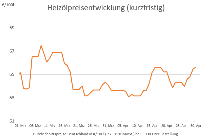 Dieser wird auch an der grafischen Darstellung deutlich, die zeigt, dass die durchschnittlichen Heizölpreise nicht nur wieder über die 65 Euro-Marke geklettert sind, sondern auch so hoch liegen wie Mitte des Monats. Im Vergleich zu den Märzpreisen ist Heizöl im April allerdings etwas günstiger gewesen, nachdem 100 Liter im März zwischenzeitlich mehr als 67 Euro kosteten.
