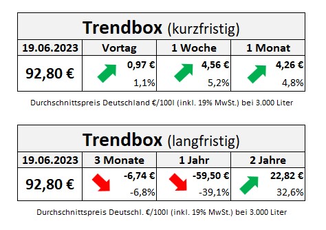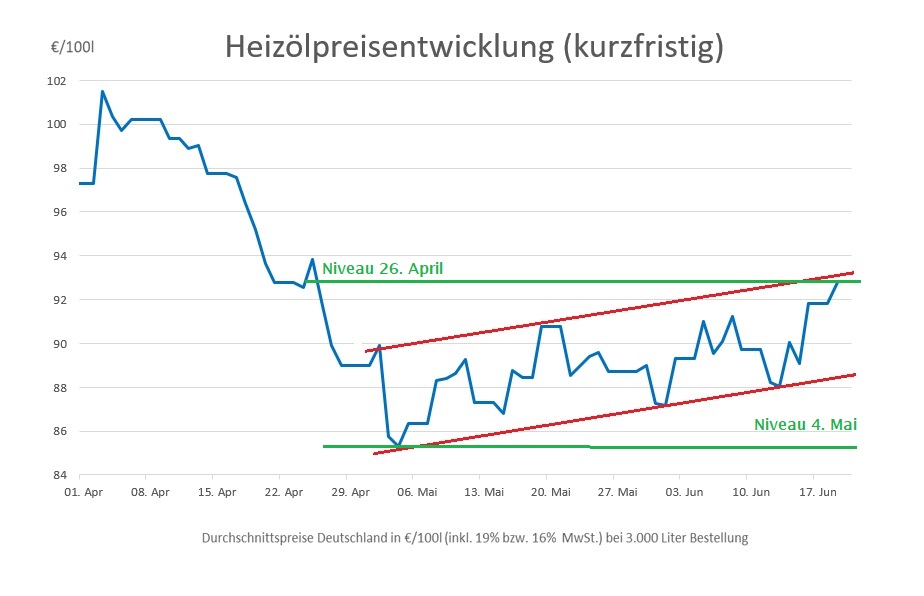 Heizöl ist damit im Bundesgebiet wieder auf dem gleichen Preisniveau wie Ende April und im Durchschnitt auch wieder deutlich teurer als am 4. Mai, als die Inlandspreise mit 85,30 Euro den bisher niedrigsten Stand des Jahres erreicht hatten. Seitdem befinden sich die bundesweiten Heizölpreise in einer Seitwärtsbewegung, die mit dem jüngsten Preisanstieg allerdings in einen flachen Aufwärtstrend übergehen könnte.