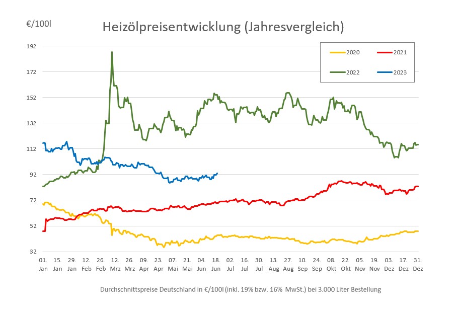 Die genannten Heizölpreise beziehen sich stets auf den deutschlandweiten Durchschnittspreis bei einer Bestellung von 3.000 Liter Heizöl Standard schwefelarm inklusive 19% MwSt. Außerdem fallen durch Transportkosten die Preise regional unterschiedlich aus, was aktuell durch die schwierige Versorgungslage in manchen Regionen noch verschärft wird. Die Preisspanne zwischen den Regionen kann daher momentan bei bis zu ca. 3,26 Euro pro 100 Liter liegen. Stand der Preise 19.06.2023.