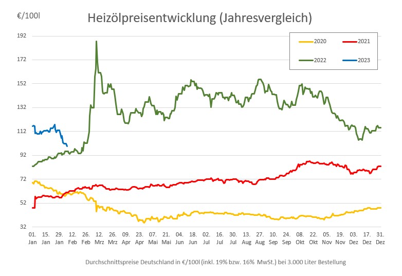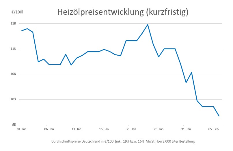 Seit dem bisherigen Jahreshöchststand am 24. Januar, als Heizöl im Bundesdurchschnitt 117,77 Euro kostete, ist Heizöl für Verbraucher etwa 18,05 Euro pro 100 Liter günstiger geworden. Seit Jahresanfang hat sich der durchschnittliche Heizölpreis um 14,5 Prozent reduziert und liegt damit inzwischen auf dem niedrigsten Stand seit Februar 2022.