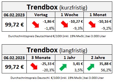 Seit dem bisherigen Jahreshöchststand am 24. Januar, als Heizöl im Bundesdurchschnitt 117,77 Euro kostete, ist Heizöl für Verbraucher etwa 18,05 Euro pro 100 Liter günstiger geworden. Seit Jahresanfang hat sich der durchschnittliche Heizölpreis um 14,5 Prozent reduziert und liegt damit inzwischen auf dem niedrigsten Stand seit Februar 2022.