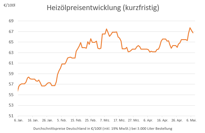 Ein Blick auf die kurzfristige Heizölpreisentwicklung zeigt, dass der deutschlandweite Durchschnittspreis mit 67,71 Euro pro 100 Liter am Mittwoch am höchsten lag und damit gleichzeitig ein neues Jahreshoch markierte. Seitdem haben die Inlandspreise allerdings wieder ein wenig nachgegeben. Im Vergleich zu gestern kosten 100 Liter Heizöl heute im Durchschnitt -0,43 Euro weniger als gestern.
