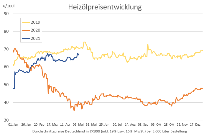 Die genannten Heizölpreise beziehen sich stets auf den deutschlandweiten Durchschnittspreis bei einer Bestellung von 3.000 Liter Heizöl Standard schwefelarm inklusive 19% MwSt. bzw. vom Zeitraum 1.Juli bis 31.Dezember 2020 16% MwSt. Außerdem fallen durch Transportkosten die Preise regional unterschiedlich aus. Die Preisspanne zwischen den Regionen kann daher momentan bei bis zu ca. 1,32 Euro pro 100 Liter liegen. Stand der Preise 07.05.2021