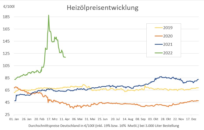 Die genannten Heizölpreise beziehen sich stets auf den deutschlandweiten Durchschnittspreis bei einer Bestellung von 3.000 Liter Heizöl Standard schwefelarm inklusive 19% MwSt. bzw. vom Zeitraum 1.Juli bis 31.Dezember 2020 16% MwSt. Außerdem fallen durch Transportkosten die Preise regional unterschiedlich aus. Die Preisspanne zwischen den Regionen kann daher momentan bei bis zu ca. 1,47 Euro pro 100 Liter liegen. Stand der Preise 11.04.2022.