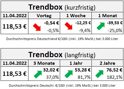 Die genannten Heizölpreise beziehen sich stets auf den deutschlandweiten Durchschnittspreis bei einer Bestellung von 3.000 Liter Heizöl Standard schwefelarm inklusive 19% MwSt. bzw. vom Zeitraum 1.Juli bis 31.Dezember 2020 16% MwSt. Außerdem fallen durch Transportkosten die Preise regional unterschiedlich aus. Die Preisspanne zwischen den Regionen kann daher momentan bei bis zu ca. 1,47 Euro pro 100 Liter liegen. Stand der Preise 11.04.2022.