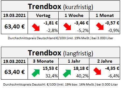 Der Wochendurchschnittspreise für diese Woche lag knapp 2 Prozent unter dem Wochendurchschnittspreise von letzter Woche. Im Vergleich zum Freitag vor einem Monat kostet Heizöl heute durchschnittlich knapp einen Euro weniger. Die kurzfristige Preisentwicklung zeigt, dass die durchschnittlichen Inlandspreise die Steigerungen, welche bisher im März verzeichnet worden waren, wieder abgegeben hat.