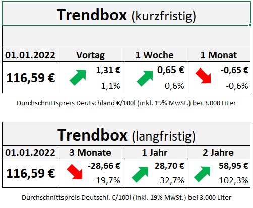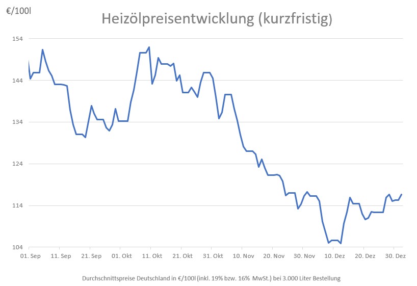 Allein seit Oktober haben die Preise im Bundesdurchschnitt um über 23 Prozent nachgegeben. Am Günstigsten war Heizöl für die Verbraucherinnen und Verbraucher zuletzt Anfang Dezember. Im Vergleich zum tiefsten Stand von durchschnittlich 104,94 Euro am 12. Dezember muss inzwischen wieder etwas mehr bezahlt werden. Insgesamt bleiben die extrem hohen Preise von letztem Jahr aber nur eine unschöne Erinnerung.