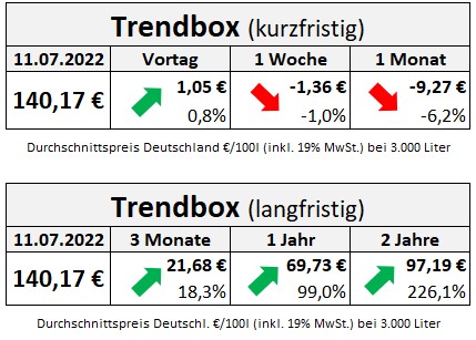 Die genannten Heizölpreise beziehen sich stets auf den deutschlandweiten Durchschnittspreis bei einer Bestellung von 3.000 Liter Heizöl Standard schwefelarm inklusive 19% MwSt. bzw. vom Zeitraum 1.Juli bis 31.Dezember 2020 16% MwSt. Außerdem fallen durch Transportkosten die Preise regional unterschiedlich aus. Die Preisspanne zwischen den Regionen kann daher momentan bei bis zu ca. 8,75 Euro pro 100 Liter liegen. Stand der Preise 11.07.2022.
