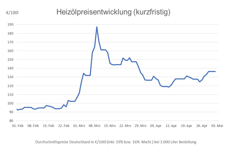 Die durchschnittlichen Heizölpreise starten mit leichten Abschlägen in den Monat Mai, bleiben aber insgesamt auf hohem Niveau. Auch die Rohölpreise an den internationalen Rohstoffbörsen bewegen sich seit einiger Zeit eher seitwärts. Für die Inlandspreise bedeutet das zwar, dass starke Ausschläge nach oben nicht zu erwarten sind, aber eben auch keine deutlichen Abschläge nach unten.