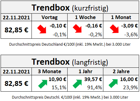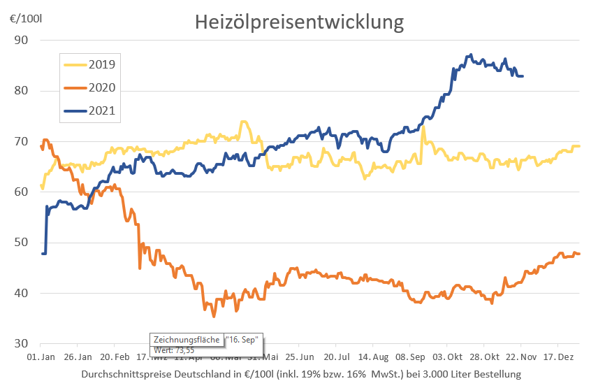 Die genannten Heizölpreise beziehen sich stets auf den deutschlandweiten Durchschnittspreis bei einer Bestellung von 3.000 Liter Heizöl Standard schwefelarm inklusive 19% MwSt. bzw. vom Zeitraum 1.Juli bis 31.Dezember 2020 16% MwSt. Außerdem fallen durch Transportkosten die Preise regional unterschiedlich aus. Die Preisspanne zwischen den Regionen kann daher momentan bei bis zu ca. 2,18 Euro pro 100 Liter liegen. Stand der Preise 22.11.2021