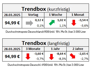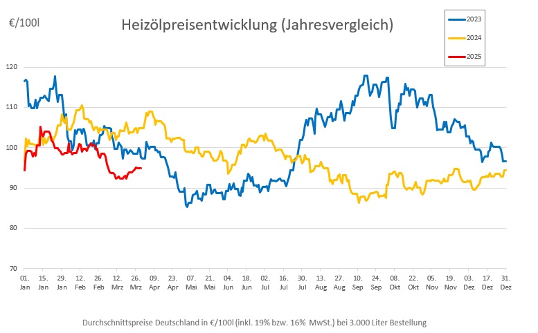 Die höchste Notierung war bereits am 3. März – und damit am ersten Handelstag des Monats – zu beobachten gewesen, als für 100 Liter im bundesweiten Durchschnitt 97,88 Euro zu zahlen waren. Den wiederum günstigsten Preis gab es am 11. März, als 92,35 Euro für 100 Liter an den Heizölhändler zu überweisen waren.