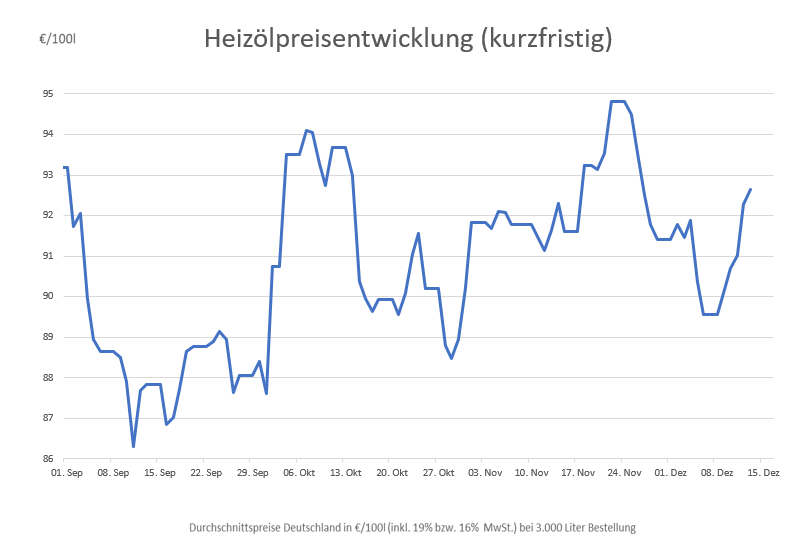 Die Preiskurve der letzten Monate zeigt allerdings auch, dass die Heizölpreise im Durchschnitt immer noch untern den Hochs von Anfang Oktober (94,06 Euro) und Ende November (94,82 Euro) liegen. Am 23. November hatten die Heizölpreise im Bundesgebiet den höchsten Stand seit dem Sommer erreicht. Von diesen Niveaus sind wir aktuell immer noch über zwei Euro entfernt.