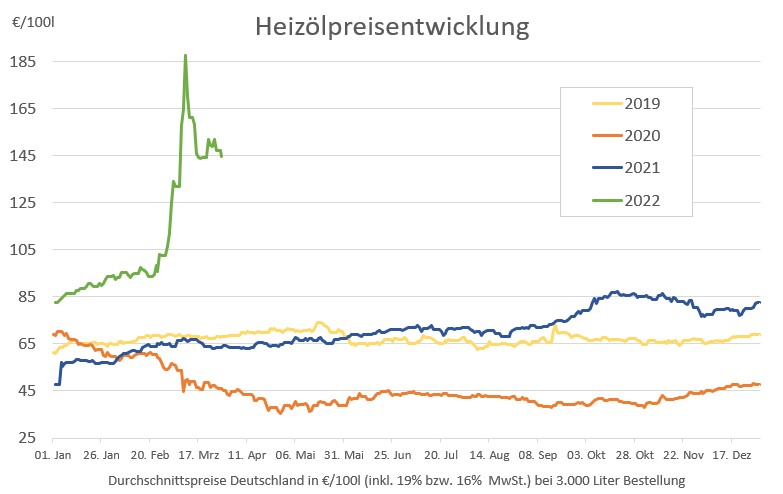 Vor allem der Mehrjahresvergleich zeigt, wie enorm hoch die Heizölpreise aktuell immer noch sind. Im Vergleich zu März 2019, also noch vor dem Preiseinbruch durch die Corona-Pandemie, kostet Heizöl heute im Durchschnitt mehr als doppelt so viel. Waren im März 2019 100 Liter noch für durchschnittlich 68, 10 Euro zu haben, mussten Verbraucherinnen und Verbraucher in diesem Monat im Durchschnitt 147,96 Euro bezahlen.