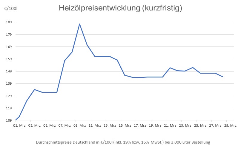 Die genannten Heizölpreise beziehen sich stets auf den deutschlandweiten Durchschnittspreis bei einer Bestellung von 3.000 Liter Heizöl Standard schwefelarm inklusive 19% MwSt. bzw. vom Zeitraum 1.Juli bis 31.Dezember 2020 16% MwSt. Außerdem fallen durch Transportkosten die Preise regional unterschiedlich aus. Die Preisspanne zwischen den Regionen kann daher momentan bei bis zu ca. 3,24 Euro pro 100 Liter liegen. Stand der Preise 28.03.2022.