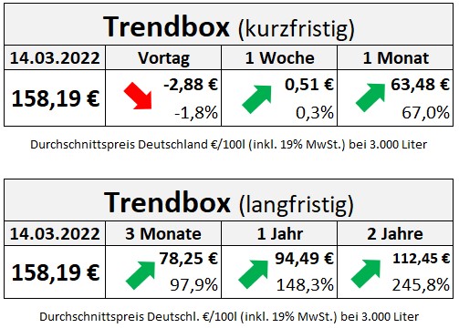 Hauptpreistreiber bleiben die internationalen Rohölbörsen, die einen kompletten Lieferstopp von russischem Öl und Gas eingepreist haben und in den letzten Wochen ebenfalls auf Rekordhochs geschossen sind. Seit einigen Tagen scheinen sich die Notierungen an de Ölbörsen jedoch etwas zu stabilisieren. Sie bleiben dabei zwar auf enorm hohem Niveau, scheinen aber die überhitzte Preisrallye zunächst beendet zu haben.
