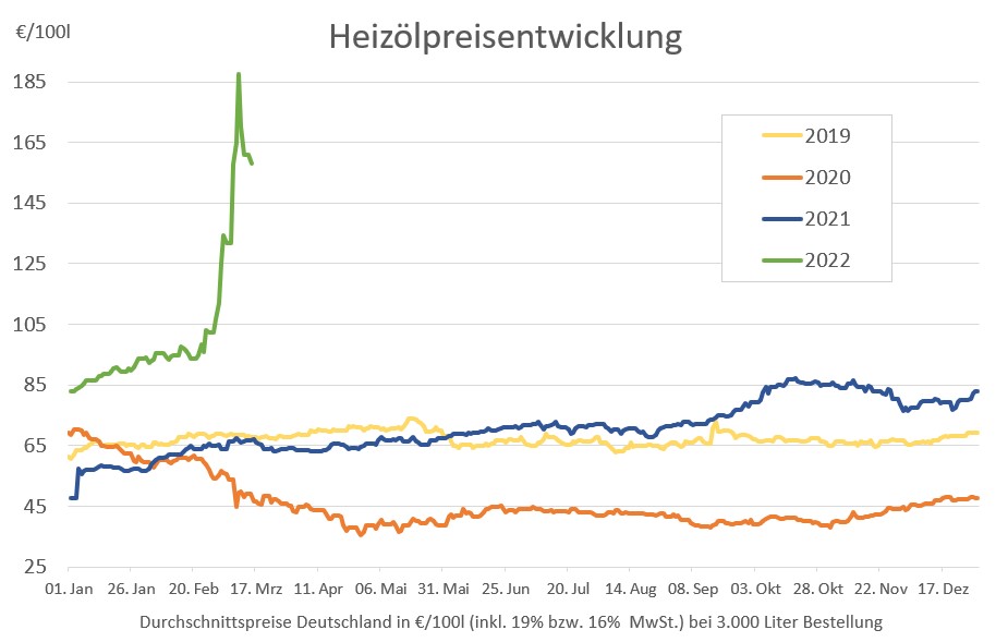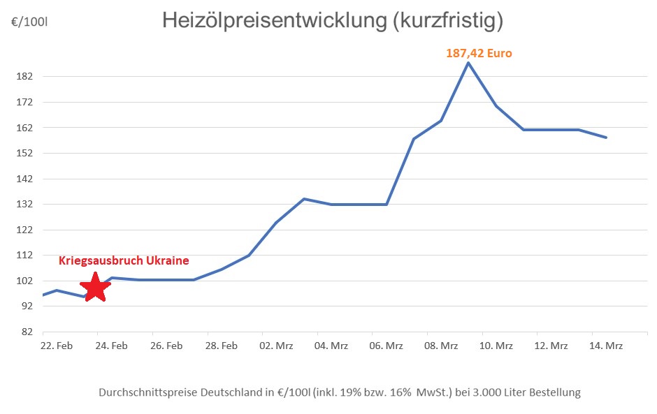 Seit Kriegsausbruch in der Ukraine sind die Preise für Heizöl in der gesamten Bundesrepublik massiv angestiegen. Kosteten 100 Liter Heizöl am 23. Februar, einen Tag vor der russischen Invasion, noch durchschnittlich 95,86 Euro, zahlen Verbraucher heute im Bundesdurchschnitt etwa 158,19 Euro. Dies entspricht einem Preisanstieg von über 65 Prozent.