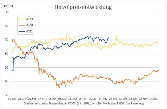 Die genannten Heizölpreise beziehen sich stets auf den deutschlandweiten Durchschnittspreis bei einer Bestellung von 3.000 Liter Heizöl Standard schwefelarm inklusive 19% MwSt. bzw. vom Zeitraum 1.Juli bis 31.Dezember 2020 16% MwSt. Außerdem fallen durch Transportkosten die Preise regional unterschiedlich aus. Die Preisspanne zwischen den Regionen kann daher momentan bei bis zu ca. 1,74 Euro pro 100 Liter liegen. Stand der Preise 27.08.2021