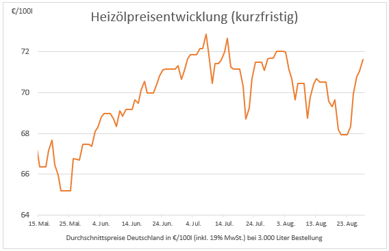 So liegen die durchschnittlichen Heizölpreise im Bundesgebiet im Vergleich zur Vorwoche über 5 Prozent höher. Allein seit gestern hat sich der Preis für 100 Liter Heizöl im Durchschnitt um über 58 Cent verteuert. Die Preisentwicklungskurve zeigt, dass Heizöl damit am Ende des Monats fast wieder genauso teuer ist wie am Monatsanfang. Die bisherigen Preisspitzen von Juli