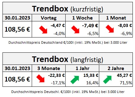 Für Verbraucherinnen und Verbraucher, die sich für die zweite Winterhälfte noch einmal eindecken wollen und Platz im Tank haben, ist somit aktuell ein guter Zeitpunkt, denn an den Ölbörsen stehen die Zeichen eigentlich auf Preissteigerungen. Die Nachfrageerholung in China sowie ein befürchteter Angebotsschock durch das nahende EU-Embargo auf russische Raffinerieprodukte könnte schon bald wieder für eine Richtungswechsel sorgen.