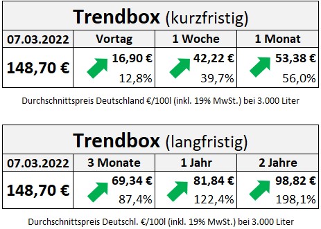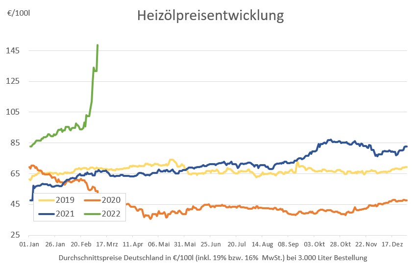 Heizöl kostet damit im bundesweiten Durchschnitt so viel wie noch nie zuvor. Allein im Vergleich zum vergangenen Freitag haben die Inlandspreise fast 13 Prozent zugelegt, eine Preissteigerung von etwa 16,90 Euro pro 100 Liter.