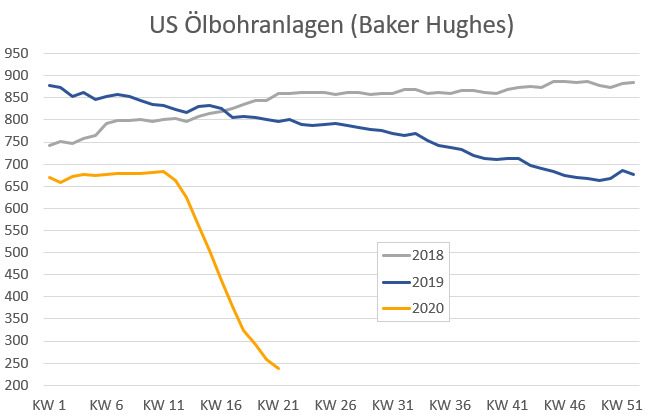 Die Grafik zeigt, dass schon 2019 die Menge der Bohranlangen etwas rückläufig war im Vergleich zu 2018, dem bisher stärksten Jahr für die Schieferölindustrie. Doch der Einbruch Mitte März war ungleich heftiger und die Menge der aktiven Anlagen rutschte von starken 670 auf inzwischen nur noch 237 ab. So wenige, wie seit 2009 nicht mehr.