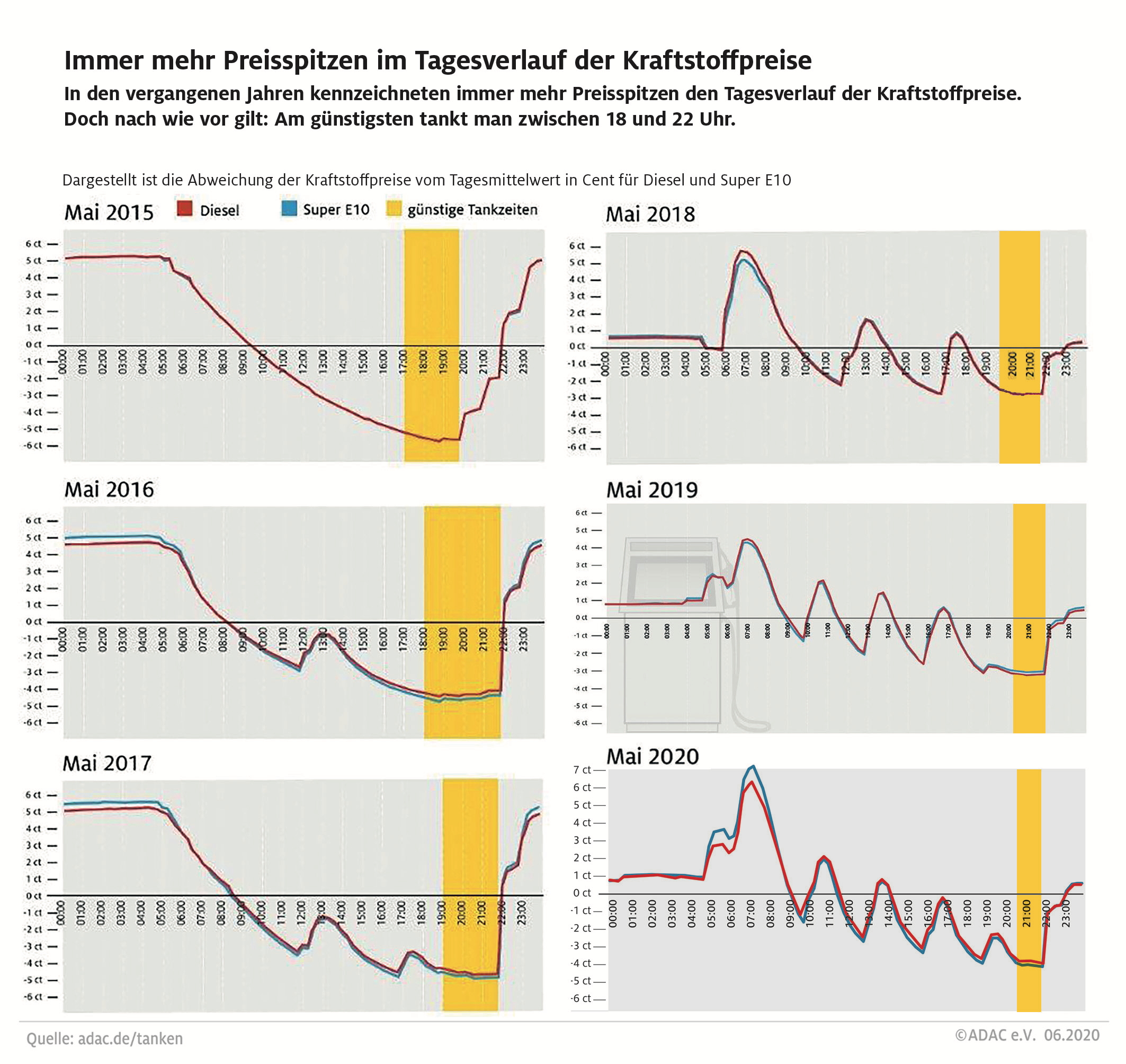 2015 bis 2020: So hat sich der Tagesverlauf der Spritpreise verändert. Ungeachtet aller Preisspitzen bleibt erkennbar, dass abends Tanken immer am günstigsten war und ist. obs/ADAC/ADAC-Grafik